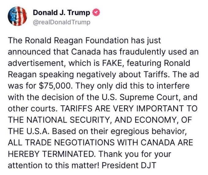 Within hours, Trump accused Canada of “fraudulently” using Reagan’s image and declared that all ongoing trade talks would be terminated.